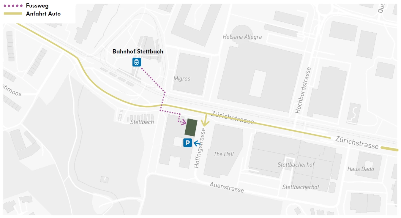 Über die Autobahn A1 bis Ausfahrt Wallisellen Richtung Dübendorf.Parkhaus im GebäudeEinfahrt an Hoffnigstrasse